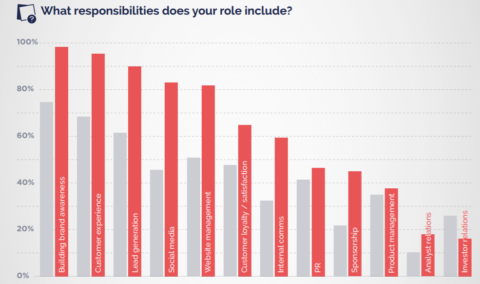 “超过50%的营销人员表示,以下九个或九个以上的主要目标是:增加销售收入、增加销售数量、客户获取、增加数字化投入、客户保留、客户满意度、员工满意度、降低成本和活动投入。”