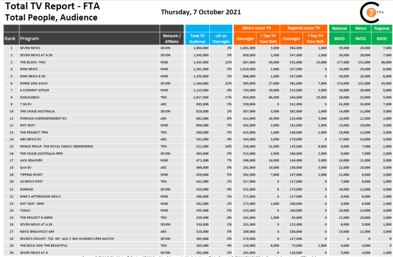 最近每天巩固总电视报道10月7日,七新闻# 1在线性和BVOD电视计划在全国范围内,有160.4万观众在BVOD包括35000。