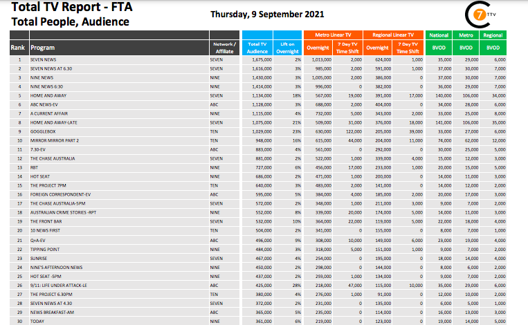 在9月9日最新的每日综合电视总报告中,Seven News是全国线性和BVOD电视节目中排名第一的节目,有167.5万观众,其中BVOD观众3.5万。