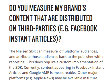 在去年7月发布的手册中,Nielsen表示:“Nielsen SDK可以衡量”关闭平台“的观众,并将这些受众归因于报告中的出版商。这确实需要SDK的自定义实现。目前,Facebook即时文章和Google AMP中出现的内容是可衡量的。其他主要平台(例如Apple News)可能会在将来可用。“