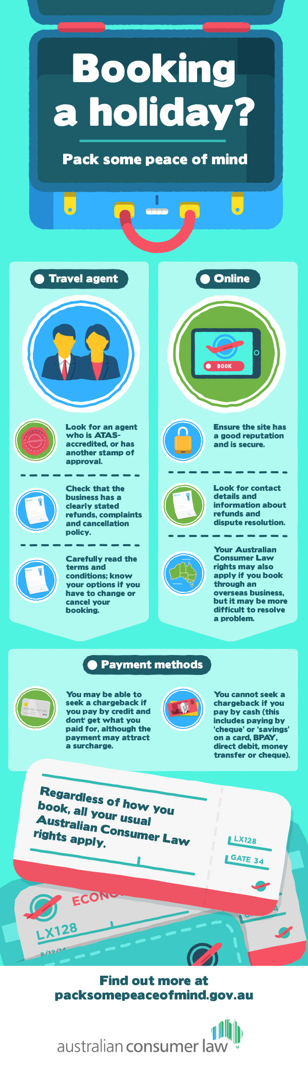 现在,政府已经削弱了一个多渠道运动,以超过两个月。使用箭头线“包装有些安心”,广告提醒消费者对监管的变化,促进使用认可的旅行社和直接人员到一个新网站,packsomexeaofmind.gov.au.。