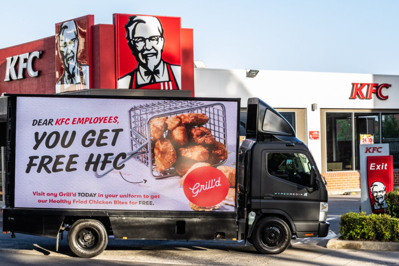 Grill'd是针对竞争对手KFC的员工,以缺陷该品牌,为统一的免费'健康炸鸡' - 或'HFC'提供员工 - 标记新产品系列的推出。
