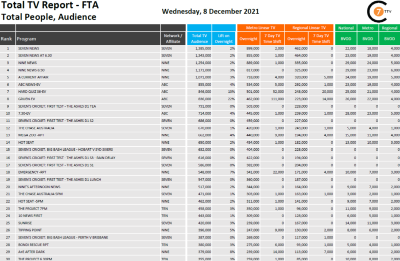 最近每天巩固总电视报道,12月8 7新闻# 1项目全国各地线性与138.5万观众包括22000国家BVOD和2%的提升。