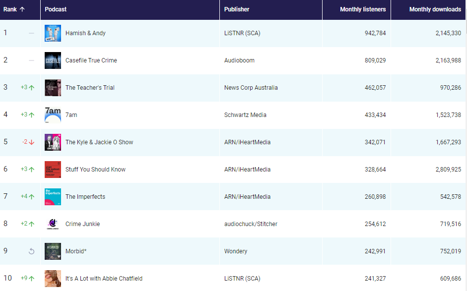 listnr/sca的Hamish&Andy继续保持最高点的Triton Digital Podcast Ranker对于7月,正如今年每个月这样做的那样,禁止一月和二月没有发行剧集。