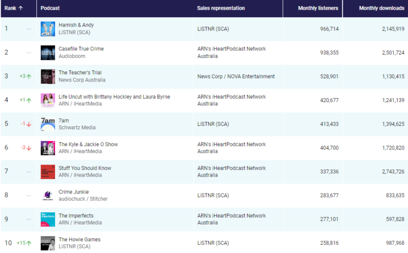 ARN/ iHeartMedia的《The Imperfects》与上个月一样保持第九名的位置,在6集的时间里拥有27万7101名的月听众。LiSTNR/SCA的《The Howie Games》从15名上升至第1名,拥有25万8816名的月听众和10集的新内容。