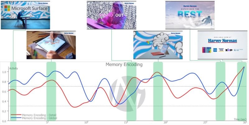 根据神经观察公司的说法,哈维·诺曼的获奖作品包括品牌书立、横幅、产品演示和“时尚”的信息,这些都促进了长期记忆编码。这则广告在第27秒左右达到了“神经峰值”,在这里,一个滑雪运动员的文字“体验最好的:”在关键的品牌框架之前被战略性地定位了。神经观察公司(neural - insights)称赞哈维·诺曼“在奥运项目背景下巧妙地使用了启动效应”,认为这一策略在关键的品牌推广时刻促进了记忆编码,并最终使该广告位居榜首。