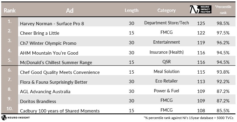 根据neural - insights在2022年进行的广泛样本测试,Harvey Norman的Surface Pro 30秒TVC位居榜首,Cheer的15秒Bring A Little TVC排名第二,Channel 7的30秒冬奥会宣传片排名第三。