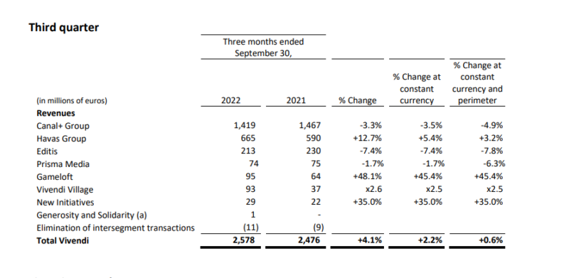 法国控股公司维旺迪(Vivendi)发布了2022年第三季度业绩,报告了全球子公司的有机增长和强劲势头哈瓦斯传媒集团.