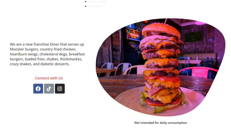 该网站广告上有一个堆叠的大汉堡的图片,旁边的文字是:“我们是一家新的特许经营餐厅,提供怪物汉堡、乡村炸鸡、胃烧鸡翅、胆固醇狗、早餐汉堡、大薯条、奶昔、浓奶昔、疯狂奶昔和糖尿病甜点。”