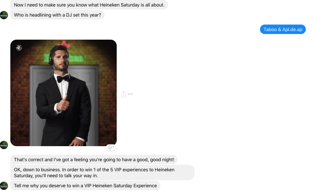 Chatbot由Zenith,Publicis Media和Momentum创建,询问用户的问题,包括谁将与Heineken星期六的DJ一起标准,以及为什么您应该成为五个赢家之一。