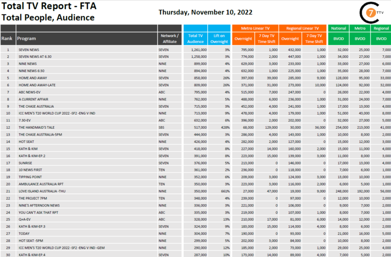 在最新的日常综合总电视报道11月10日,七是六点半新闻# 1在线性计划在全国范围内,有126.1万观众,其中包括32000 BVOD和3%的提升。婢女的故事在SBS的最大提升478%,总共就被观众517000年和254000年在BVOD。