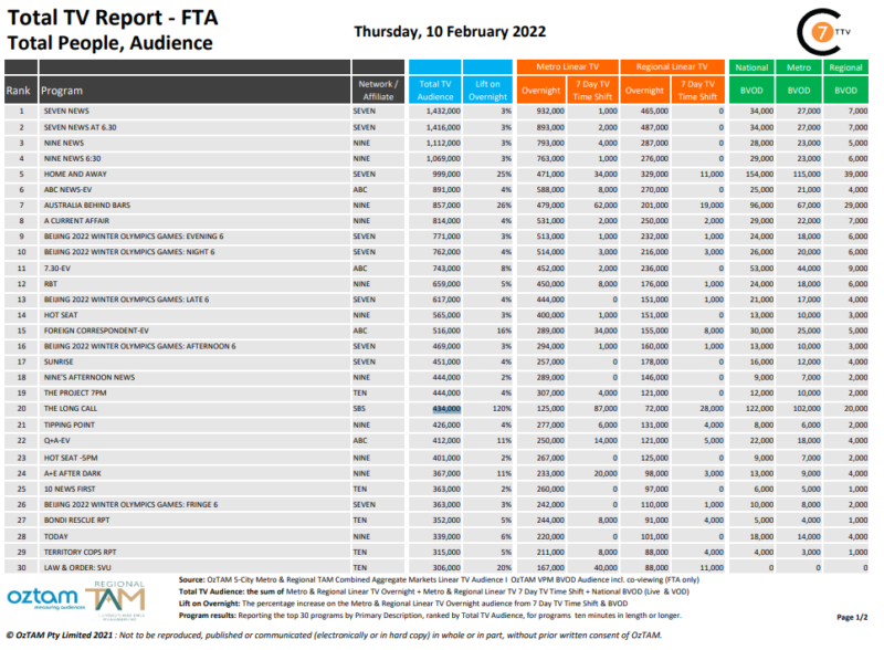 在2月10日的最新综合电视报道中,Seven News以143.2万的总观众人数位居榜首,其中包括全国34000名BVOD观众,上升了3%。