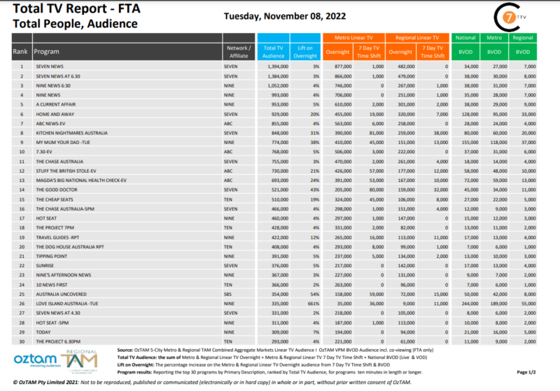 这一集为《七人》带来了45.8万名地铁观众,而该电视台的The Chase Australia在娱乐节目中排名第二。