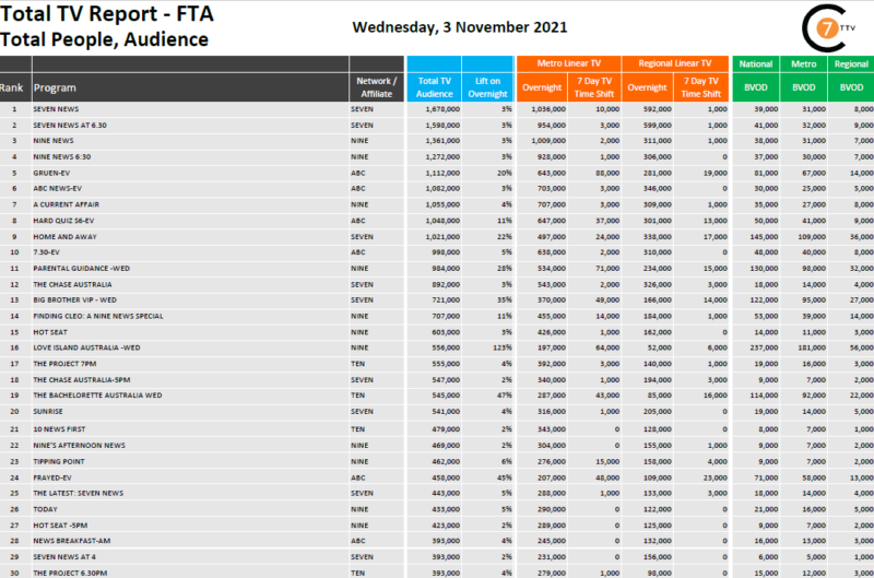 最近每天巩固总电视报道11月3日,7个消息是# 1项目全国各地线性国家BVOD 167.8万观众,包括39000和3%的提升。