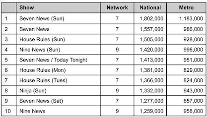 除了新闻广播,九的忍者武士在地铁评级平均首都观众943000(全国1.332)上周日。