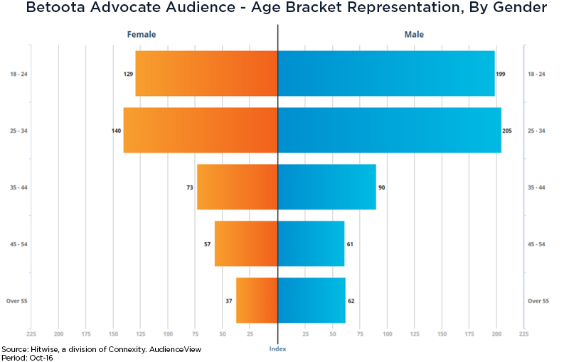 为了回答这个问题,我使用了Hitwise的消费者分析工具AudienceView,建立了一个访问The Betoota Advocate的互联网用户的定制受众群体。首先,这些受众的人口特征是什么,他们与一般的在线人群相比如何?