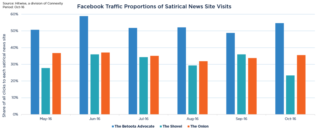 虽然Facebook的高流量对于讽刺新闻网站来说很常见,但The Betoota Advocate就是一个很好的例子,它在Facebook上的流量比例一直低于其他同类网站: