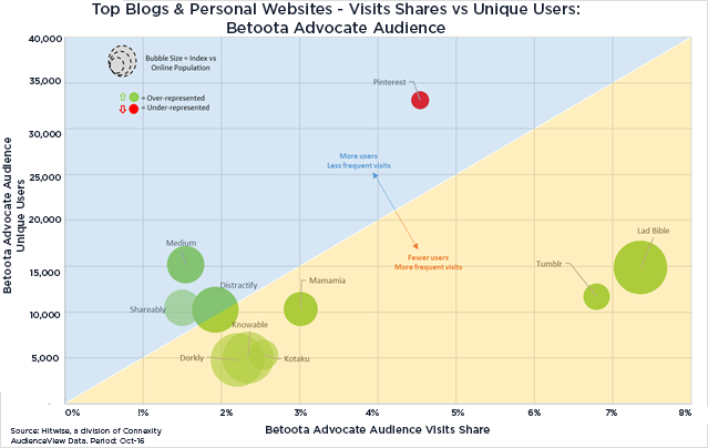 通过将访问份额与独立用户进行对比,我们可以一目了然地捕捉到平均访问频率,从而衡量访问者对这些顶级博客和个人网站的参与度。