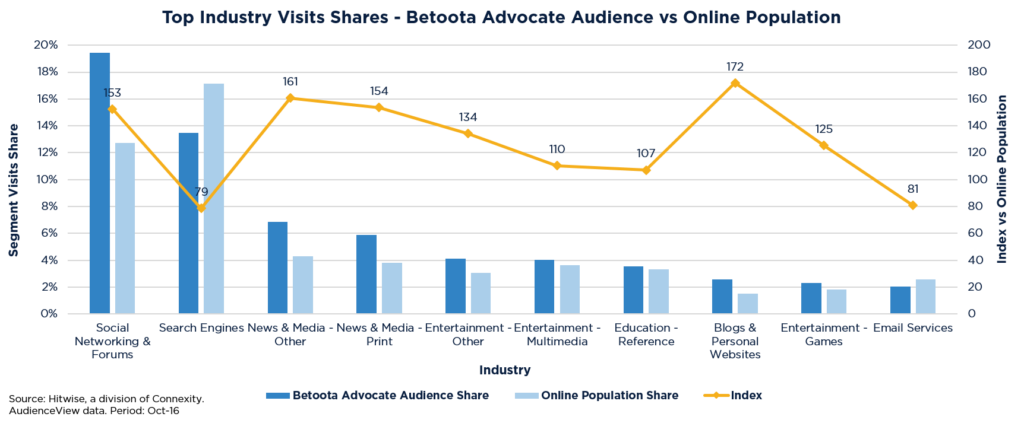 从高水平开始,这些受众被哪些主要的在线行业所吸引?通过将其行业访问份额与在线人口进行比较,我们可以突出对这些热心的Betoota倡导者读者有价值的关键行业。