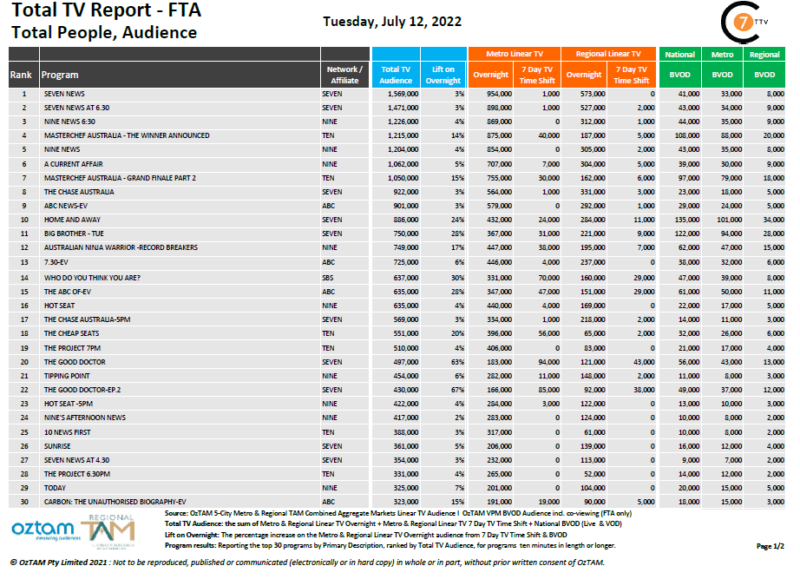 在7月12日的最新每日整合电视报告中,有七个新闻是全国各地的最佳节目,其中有15.69亿观众,其中包括41,000名BVOD,增长量为3%。最大振奋人心的节目是七名的好医生,升高为67%,总共430,000台电视观众观看,而BVOD则为49,000。