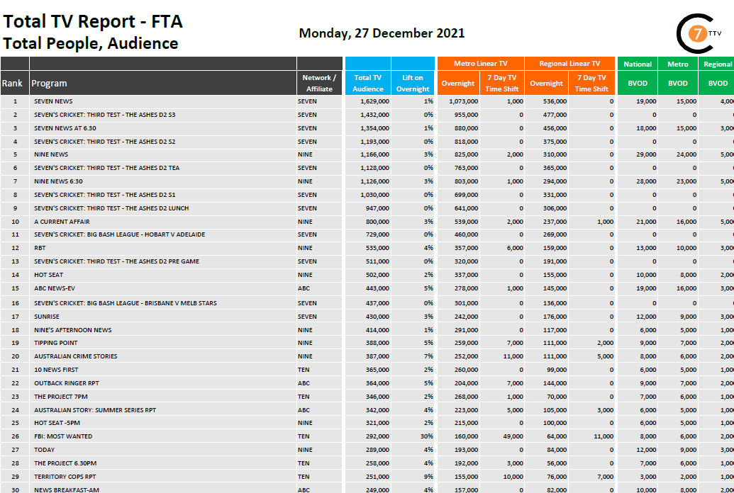 在最新的日常综合总电视报道12月27日,七消息是# 1在线性和BVOD电视计划在全国范围内,有162.9万观众在国家BVOD包括19000。