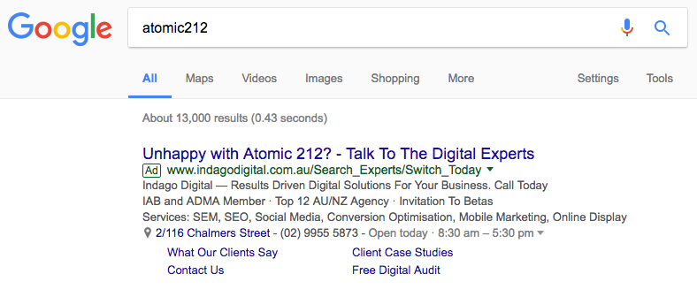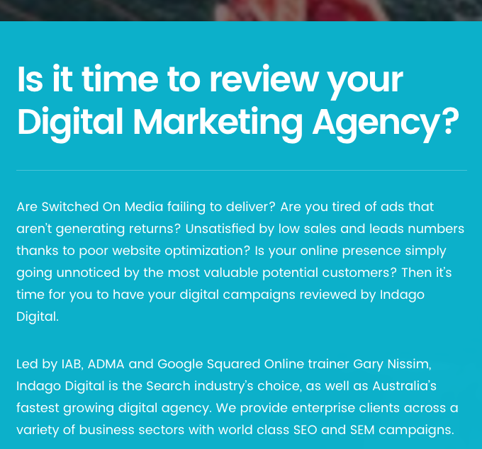 然后广告链接到Indago网站上的一个页面它问:“Atomic212是否未能将您的结果转化为核心?你是否厌倦了无法产生回报的广告?不满意低销售和领先数字,由于糟糕的网站优化?你在网上的存在是否只是被最有价值的潜在客户所忽视?然后是时候让Indago digital审核你的数字营销活动了。”