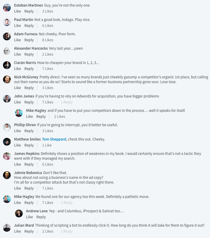在LinkedIn上的一个讨论中在英国,这一策略已经为自己赢得了大量的指责,“打开”的媒体总监迈克·哈格利称其“可悲”,美国运通的大老板Ciaran Norris建议“如何降低你的品牌”,We Are Social的前老板朱利安·沃德建议他计划创建一个脚本,无休止地点击广告,耗尽Indago的预算。