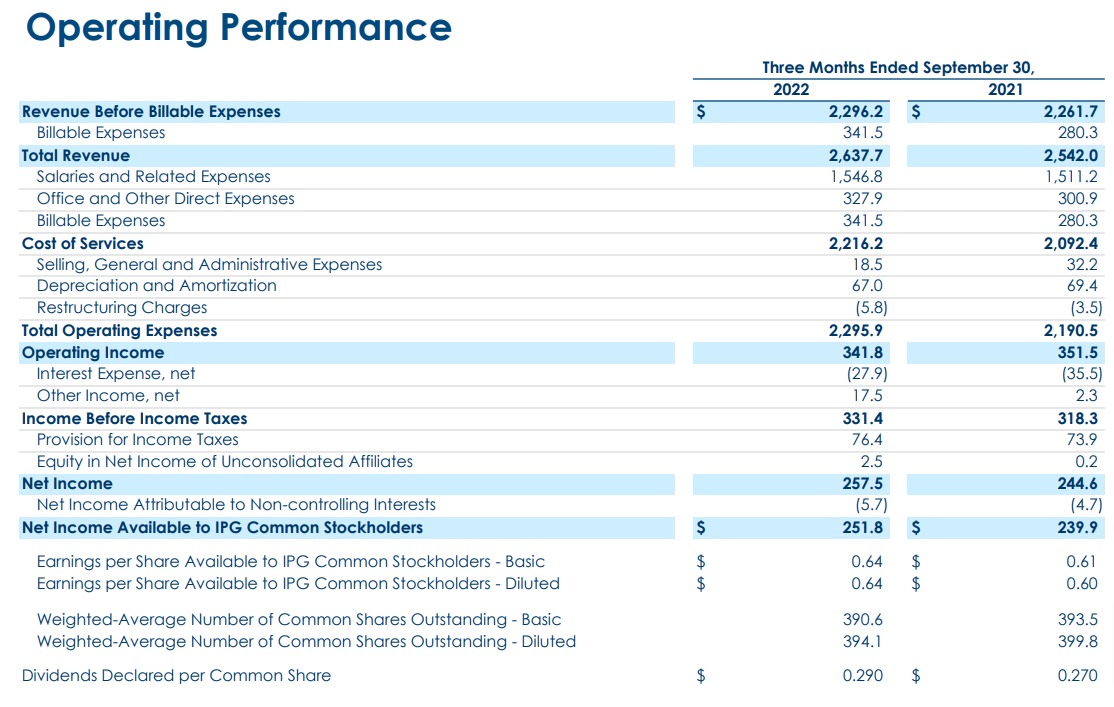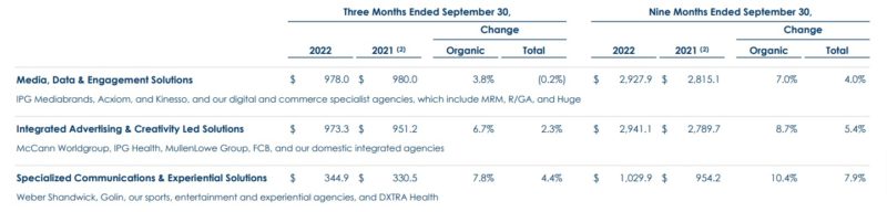 Interpublic Group Mediabrands (IPG)发布了其2022年第三季度和前九个月的业绩,显示净收入为23亿美元(35.9亿澳元),同比增长1.5%,有机增长5.6%。
