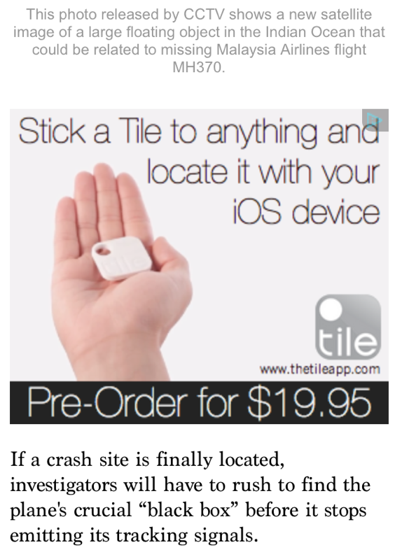 Mumbo博士 讽刺广告跟踪 2014年3月24日8:46 有针对性的广告可能是新的黑色,但与其他广告类型不同,有一个明确的缺乏感觉检查,检查了一些广告最终的位置。 举例为例如有用的瓷砖设备的目标广告,这承诺允许用户跟踪其与IOS设备上的任何内容。 不幸的是,它跟踪了Mumbo博士到一个关于马来西亚航空公司航班MH370失踪的故事。 广告 然后拒绝孤独地离开他。 广告