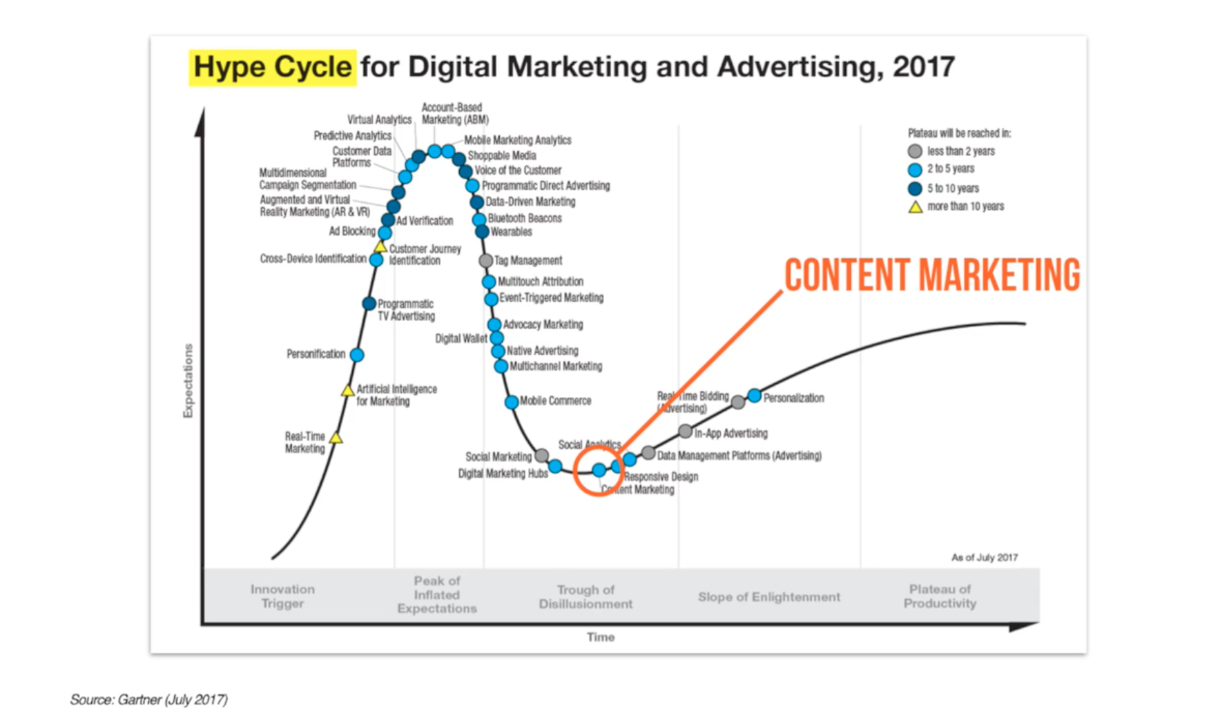 广告界喜欢宣称事物已死。但在King Content关门后,2017年Gartner炒作周期将内容营销完全置于幻灭的低谷之中,很难否认内容营销至少没有严重的流感病例。但这严重吗?