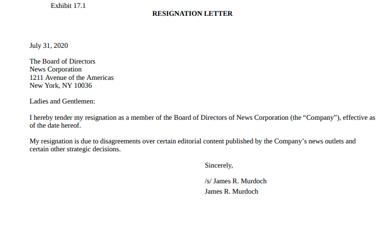 默多克说,辞职是由于“公司新闻媒体发表的某些编辑内容”以及“某些其他战略决策”的分歧。