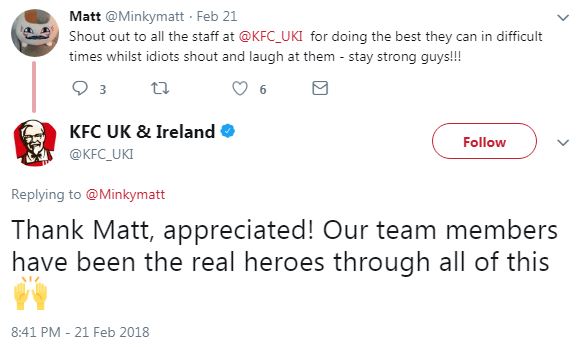 成千上万的用户在Twitter上引起骚动,@KFC_UKI不得不回应。我喜欢想象社交媒体经理被拖入一个会议被告知:“对,所以,事情是这样的…我们没有鸡。“你说什么? !