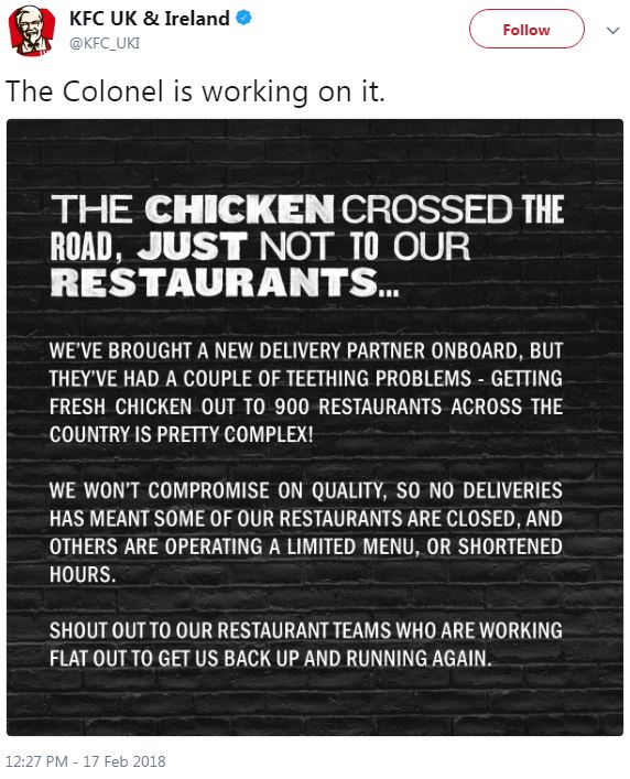 2月19日,肯德基的鸡肉(awk),和600年的900个在英国的商店被迫关门。所以,在# KFCCrisis趋势和竞争对手采取廉价的照片”,我们了解危机管理社交媒体?