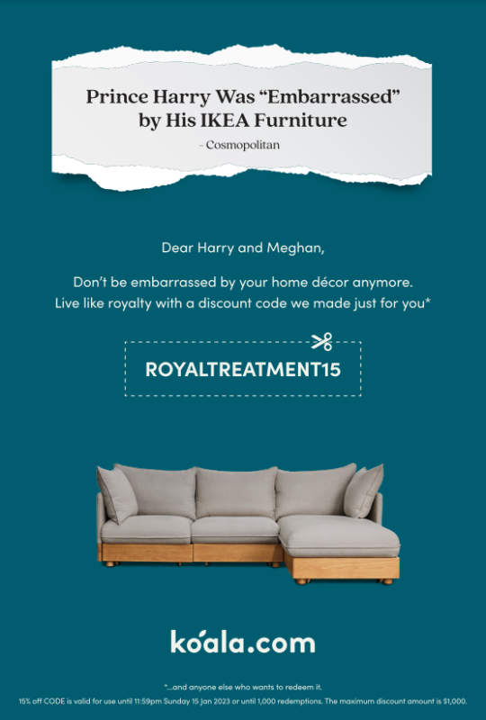 考拉给哈里王子提供了一个皇家折扣码,以回应“宜家”的耻辱