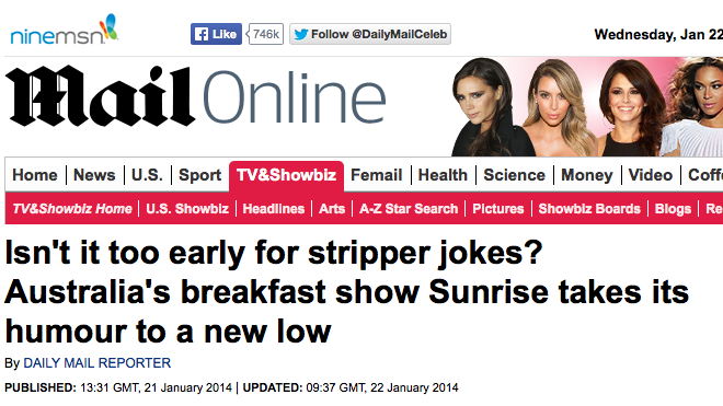 昨天,这场被News.com.au称为“脱衣舞门”的争吵爆发在科赫拿着一根杆子出现在屏幕上,Armytage把她的腿绕在杆子上,澳大利亚的《每日邮报》与Nine Entertainment Co合作,并发表了一篇题为“现在说脱衣舞娘笑话是不是太早了?澳大利亚的早餐节目《日出》将幽默带到了一个新的低点”。