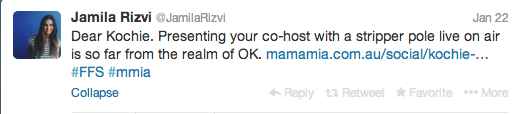 Mamamia Mia Freedman的创始人和编辑Jamila Rizvi在推特上收到了“强奸和死亡威胁”,因为《日出》节目主持人大卫·科赫今天早上攻击他们,称他们把他描述成一个“肮脏的老男人”,此前该节目的在线时尚部分将联合主持人萨曼莎·阿米塔奇的鞋子称为“脱衣舞娘鞋”。