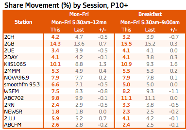 同时,纪伊调频的获奖运行在悉尼drivetime拉伸,在蒂姆·罗斯搬到第一调频节目第一次的份额为10.5%,高于8.7%。1.8评级的跳点在悉尼是最大te的显示在任何时间段。罗索搬过去新星的凯特,蒂姆&马蒂从10.6%下降到10.4%。