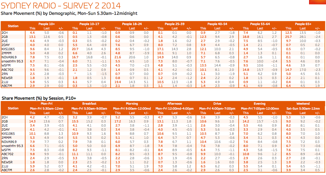 总的来说,谈话站2 gb仍然顶部站周一到周日份额为13.1%,高于12.6 cent.2GB的周一到周五份额从13.6%上升至14.3。早餐和2 gb的艾伦·琼斯仍表现整体份额为15.5%,高于15.2%。和2 gb的雷哈德利在中期早上评级的份额为17.2%,高于16.3%。