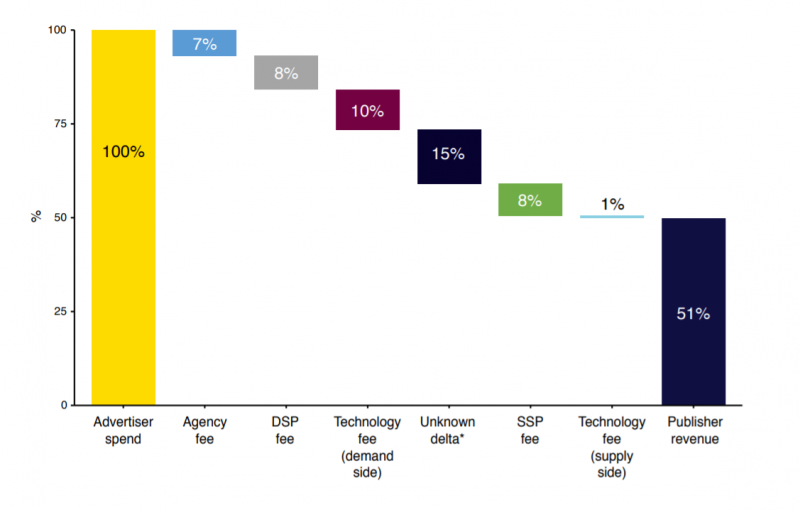 一项为期15个月的针对程序化供应链的调查显示,广告购买中49%的费用被代理和平台支付,15%流入“未知三角洲”,这意味着一半的成本没有到达出版商手中。