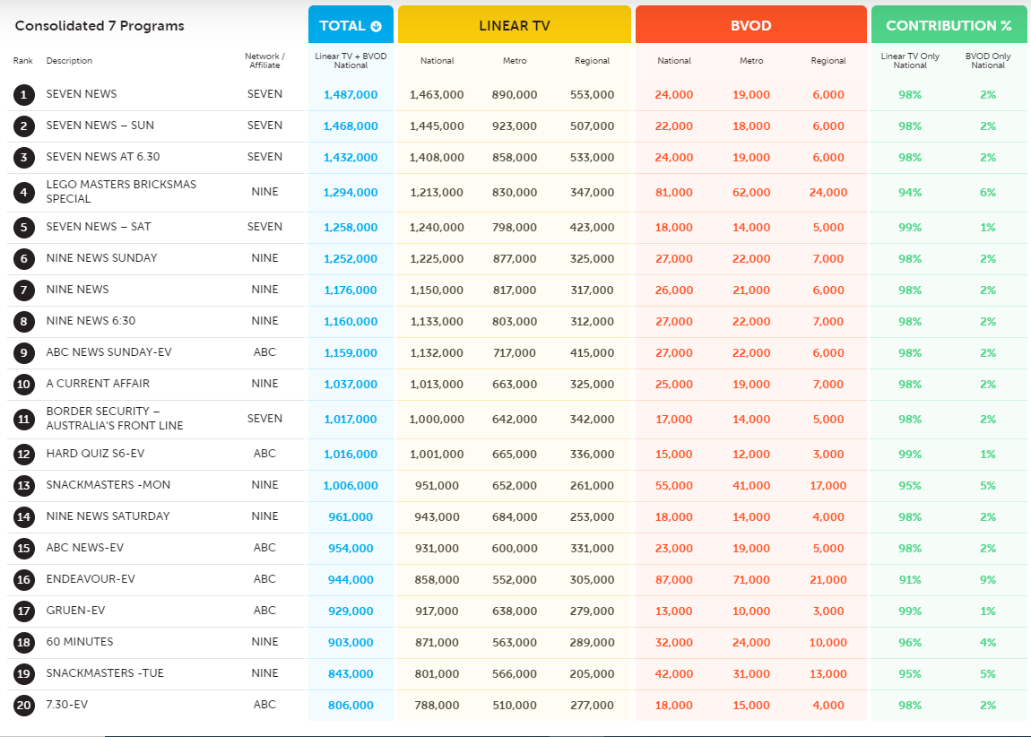 然而,总的来说,总体上是七个新闻,全国有14.87亿观众,BVOD的观众为24,000,而BVOD的观众为2%。