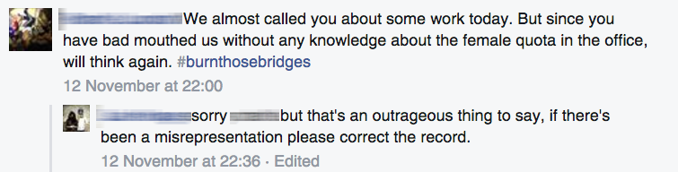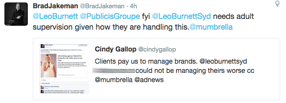 然而,李奥贝纳的一位员工在悉尼,发布,她没有深刻的印象:“我们几乎今天打电话问你一些工作。但既然你坏嘴我们没有任何知识女性配额的机构,我们将再想想。# burnthosebridges”。