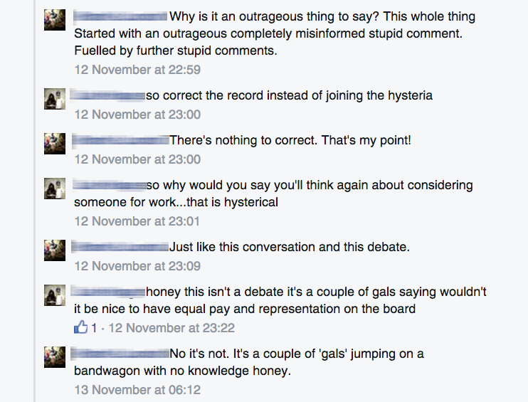 虽然已经删除对话,在一个开放的Facebook的个人资料,一些观察家震惊了对话的截图和共享Mumbrella与平等运动辛迪疾驰,他贴在她的推特上。