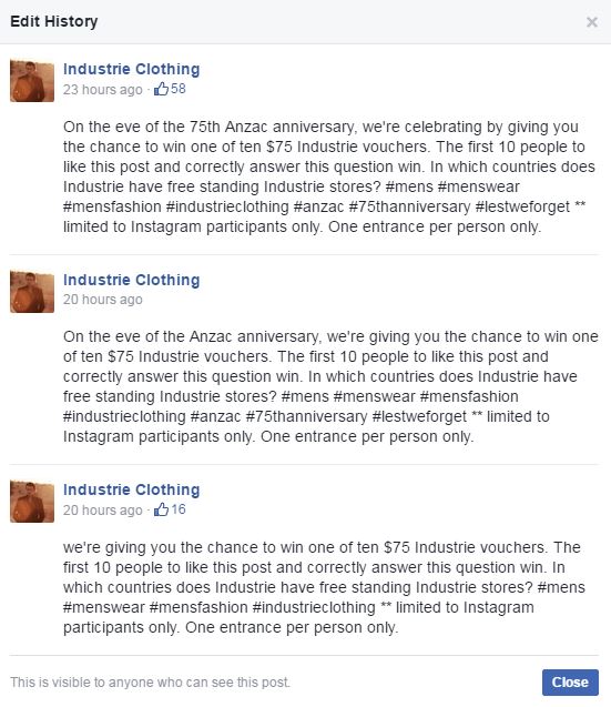 “在ANZAC周年纪念日前夕,我们通过为您提供赢得10美元的75美元工业凭证之一的机会来庆祝。前10个人喜欢这篇文章并正确回答这个问题。工业公司在哪些国家拥有自由的工业商店?”