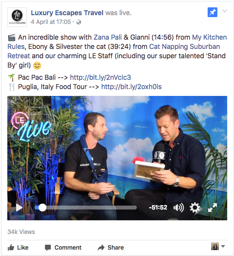 澳大利亚增长最快的旅游公司、豪华逃已经启动了一个电台节目通过Facebook Live作为计划的一部分,使品牌更加“个人”。
