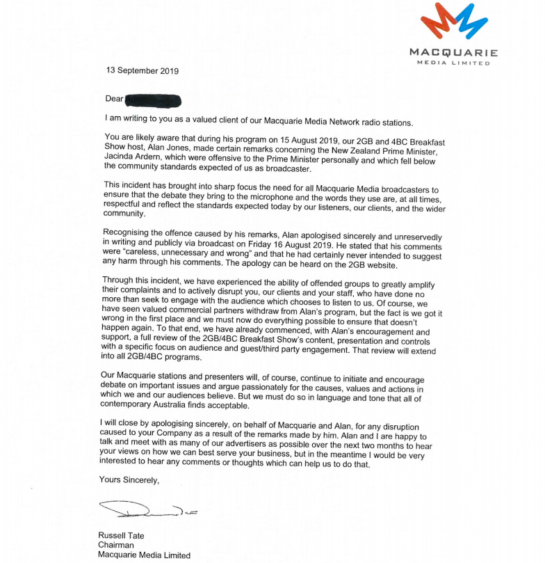 2GB广播公司已经开始了一场公关攻势,写信给广告商,为艾伦•琼斯的直播行为道歉,并向客户提供与管理层和琼斯会面的机会,听取他们对该电台如何恢复的看法。