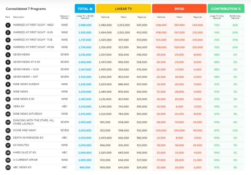 周日的《结婚》一幕剧集是第二名,全国有192.2万观众。MAFS的星期二晚上是第三场节目,全国有1737万观众。
