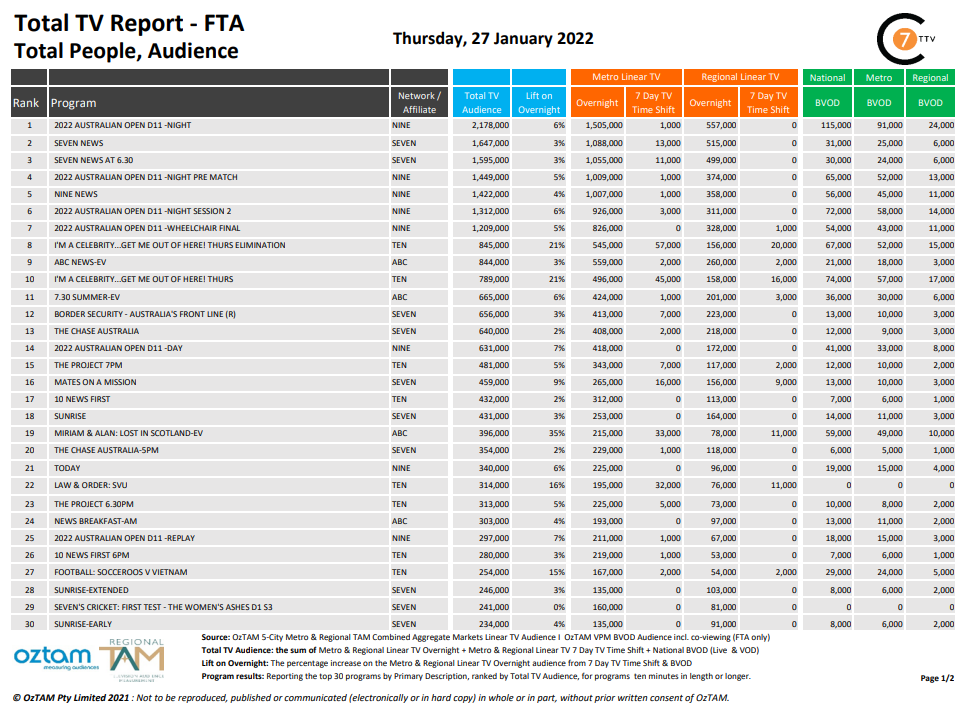 总体而言,收视率最高的节目是《Seven News》,有93.1万名地铁观众,其次是《Seven News》,有90万名地铁观众。