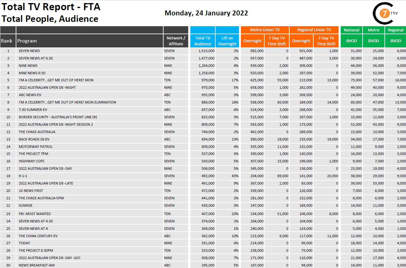 在最新的日常综合总电视报道1月24日,七个消息是在线性# 1计划在全国范围内,有151.5万观众,其中包括31000 BVOD和2%的提升。