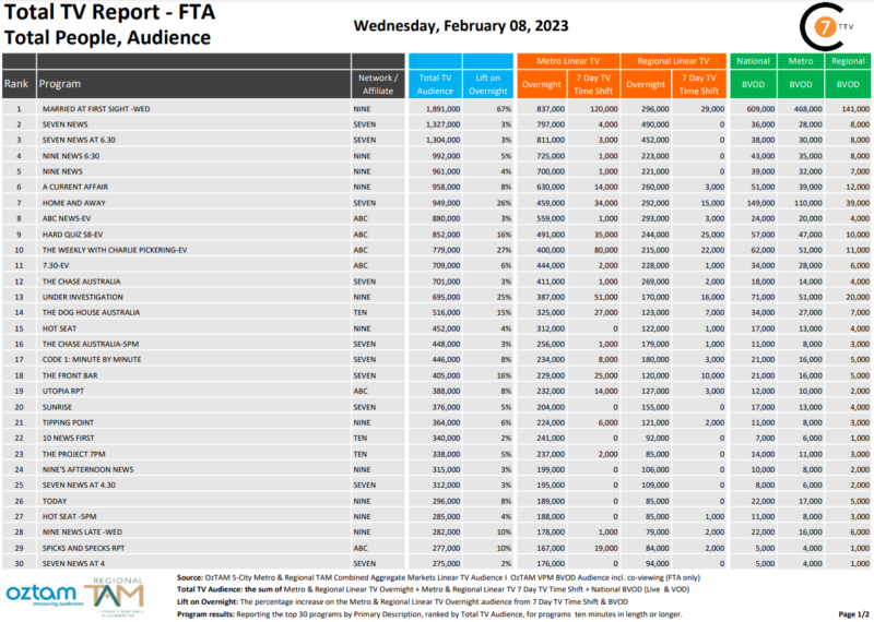 最近每天巩固7总电视报道2月8日,于上周三是# 1项目全国电视观众总数为189.1万,其中包括609000 BVOD和最大的提升67%。