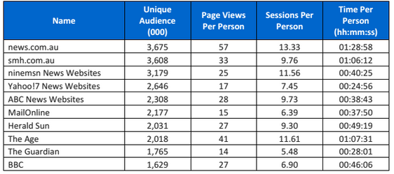 《先驱太阳报》(Herald Sun)是新闻集团传统报纸网站中唯一一家挤进前十名的网站,其在线读者人数为2031万,而《每日电讯报》(Daily Telegraph)和《信使邮报》(Courier Mail)均仅以1506万和1511万的在线读者挤进前十名。